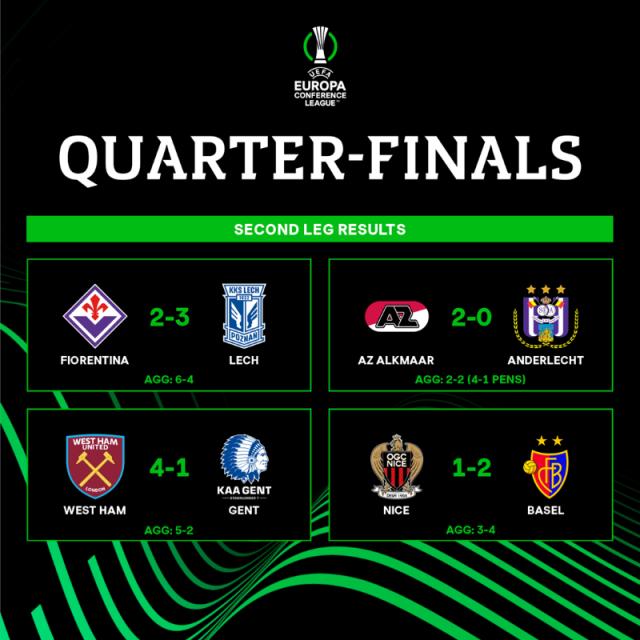欧协杯1/4决赛两回合全部战罢:西汉姆联总比分5比2淘汰根特,佛罗伦萨总比分6比4淘汰波兹南莱赫,巴塞尔总比分4比3淘汰尼斯,阿尔克马尔总比分2比2安德莱赫特(点球4比1)。